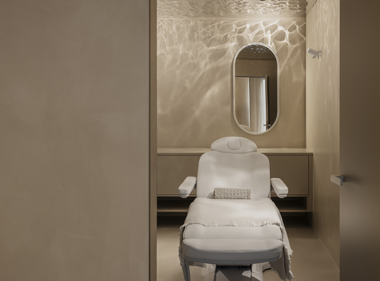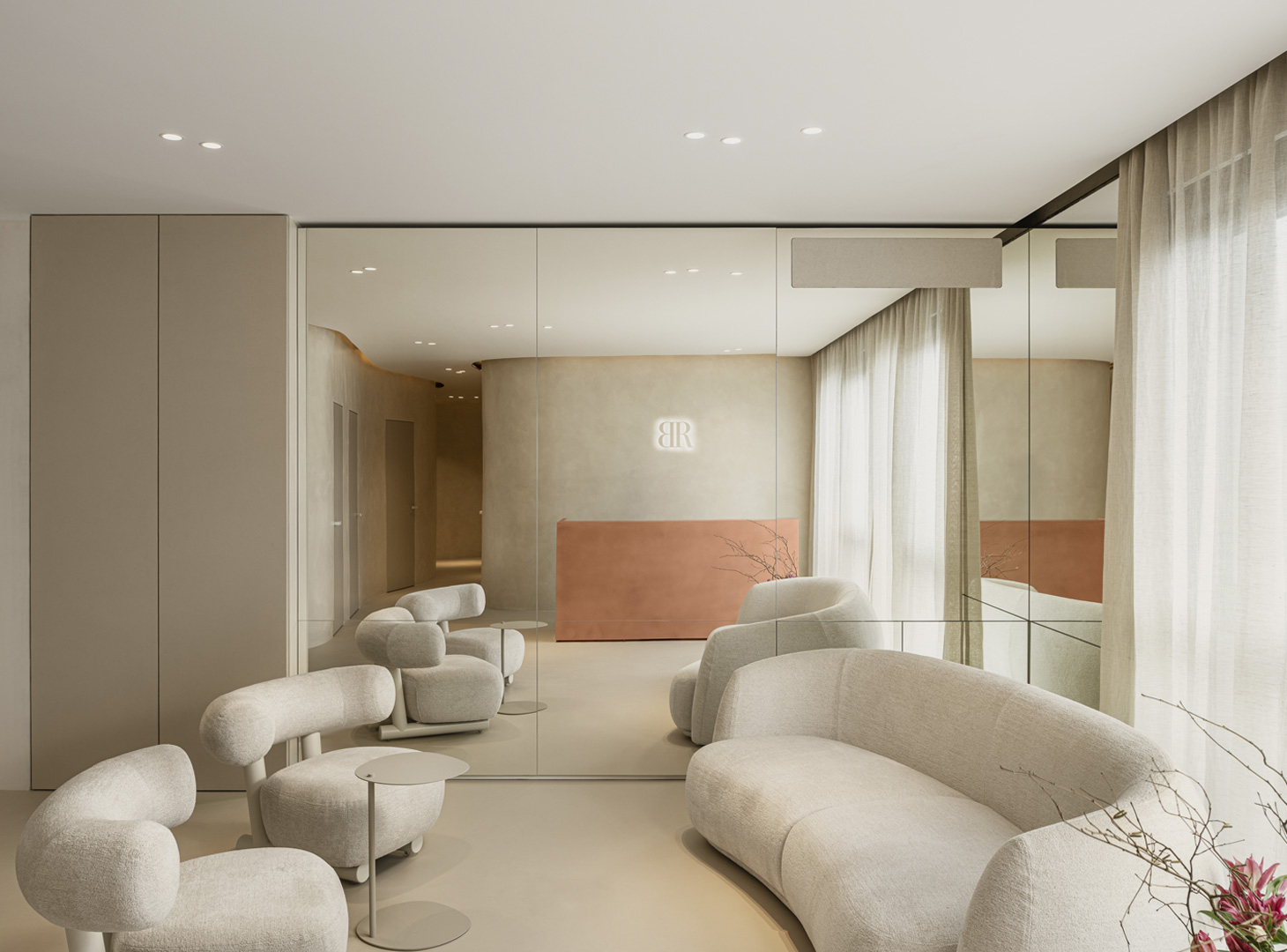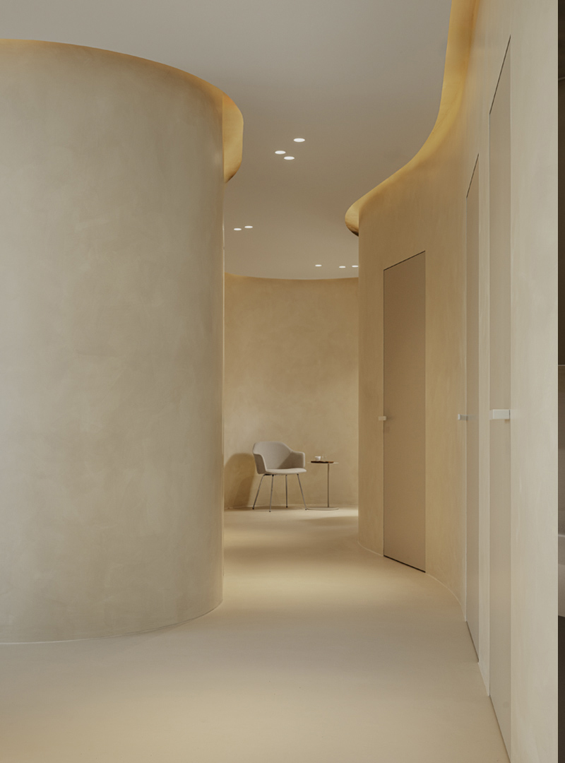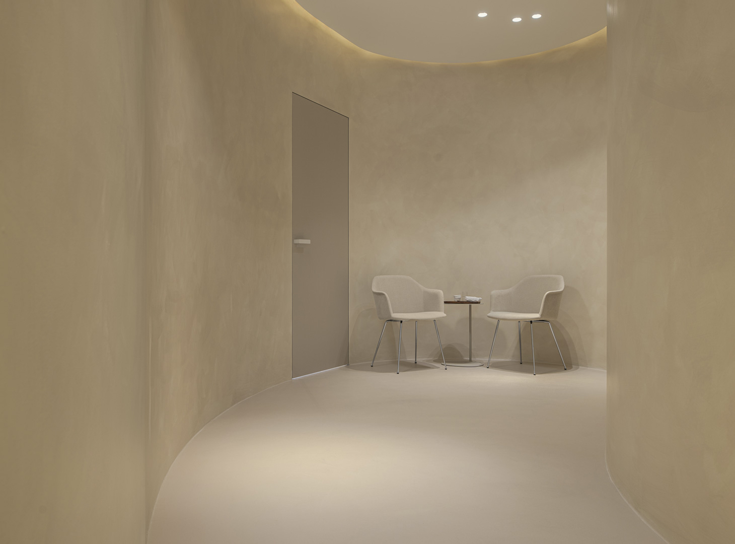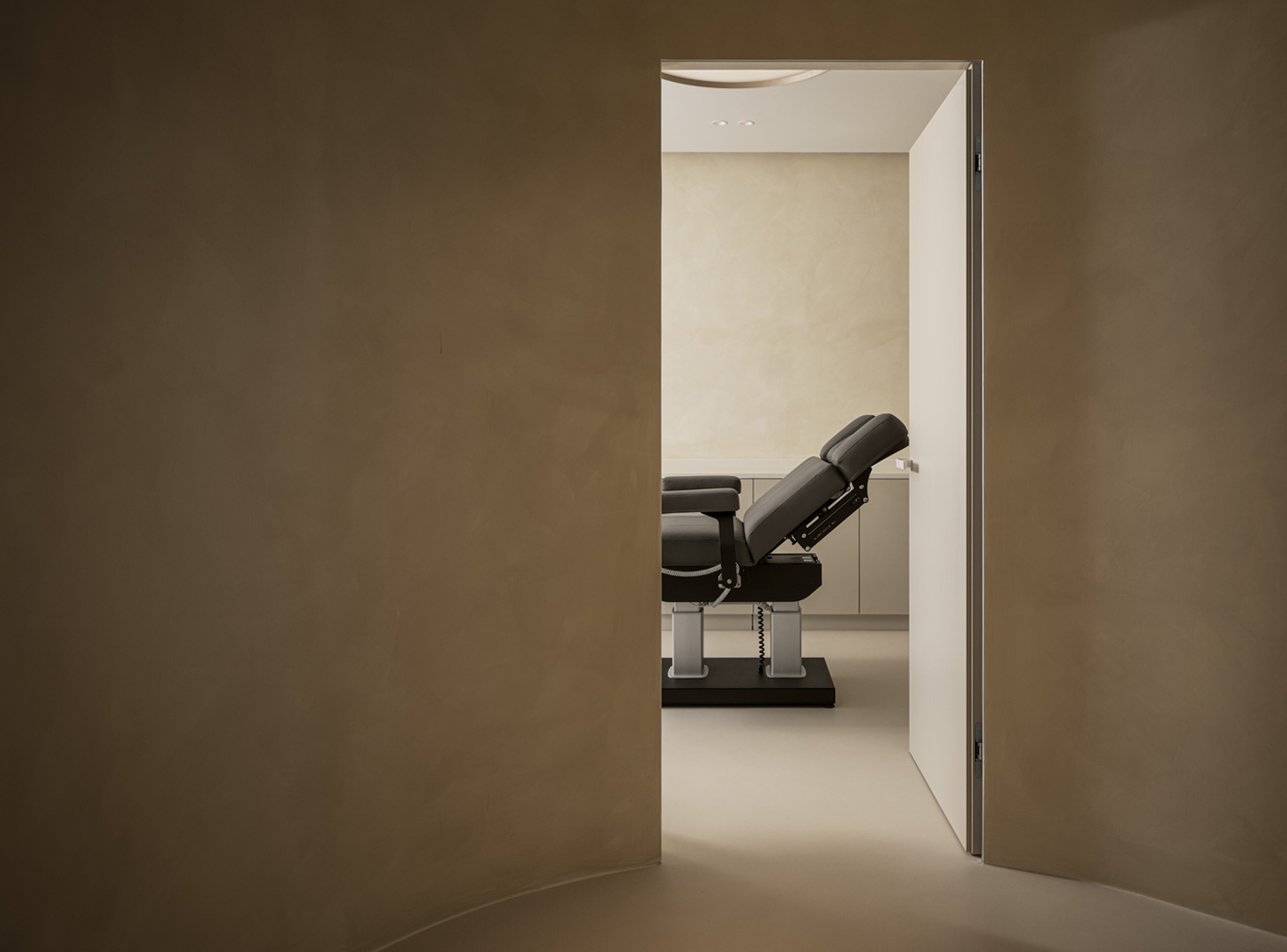 Aesthetic clinic in Austria with walls coated in Claywash and Cemher microcement floors, where continuous finishes create an elegant, natural, and functional space designed for well-being and visual harmony.